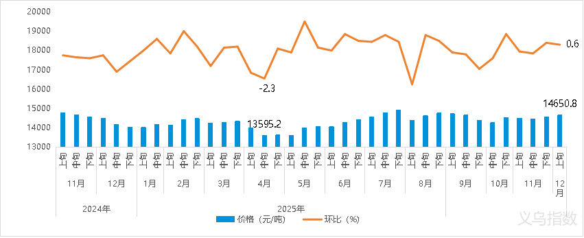 The price rose slightly in December: The price of cotton (lint cotton, white cotton grade three) in the national circulation field in the first ten days of December 2025 was 14,650.8 yuan per ton, an increase of 80.6 yuan per ton compared with the end of November. With the rapid advancement of new cotton sales, the sales progress is faster than that of the same period last year. The pressure of high production is gradually being digested, and the spot market quotations remain relatively firm. Meanwhile, the convening of the Central Economic Conference has brought confidence to the market, and domestic cotton prices have continued to rise.