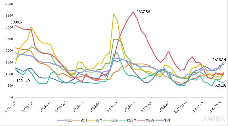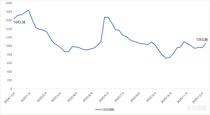 Ningbo Zhoushan Port undertakes a large amount of export business of small commodities from Yiwu and is an important seaport for Yiwu. According to the latest monitoring by Yiwu Index, on December 12, 2025, the Ningbo Container-based Freight Index (NCFI) closed at 1,060.86 points, up 0.7% from the beginning of November. In November, shipping market freight rates showed a differentiated trend: on the European route, freight rates rose significantly as cargo volume picked up and space became tight, while on the American route, market shipments weakened and freight rates continued to decline.