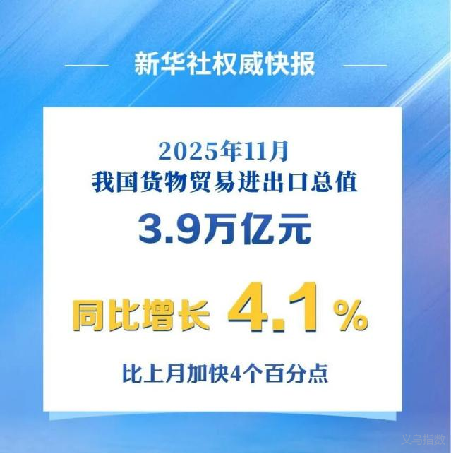 According to data from the General Administration of Customs, in November 2025, the total value of China's goods trade imports and exports reached 3.9 trillion yuan, with the growth rate rebounding to 4.1%, an increase of 4 percentage points compared to the previous month. In terms of cumulative figures, in the first 11 months of this year, the total value of imports and exports was 41.21 trillion yuan, increasing by 3.6% year-on-year. Among them, exports were 24.46 trillion yuan, growing by 6.2% year-on-year. In terms of trading partners, in the first 11 months, ASEAN was China's largest trading partner, with a total trade value of 6.82 trillion yuan, an increase of 8.5% year-on-year, accounting for 16.6% of the total foreign trade value. The European Union is the second largest trading partner, with a total trade value of 5.37 trillion yuan, an increase of 5.4%, accounting for 13% of the total foreign trade value. During the same period, China's total imports and exports with the countries along the Belt and Road Initiative reached 21.33 trillion yuan, an increase of 6%.
