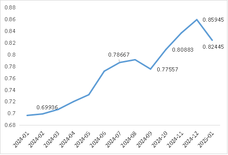 2024年1月-2025年1月人民币对巴西雷亚尔参考汇率走势图