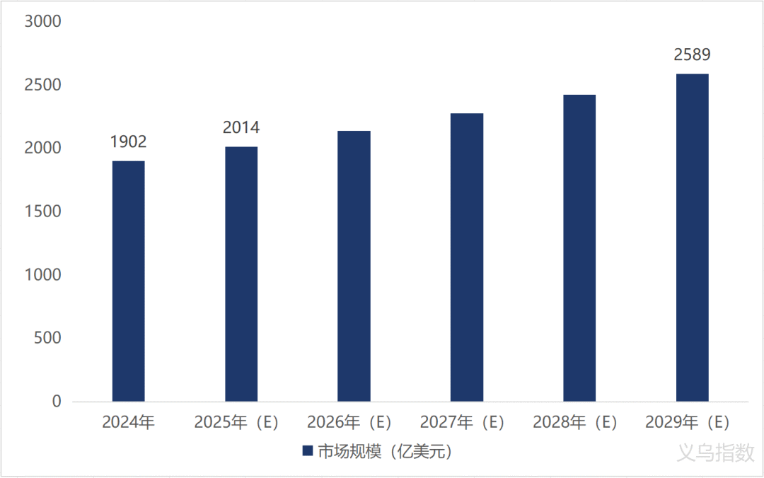 从全球箱包行业市场规模来看,2024年整体规模约为1902亿美元,未来五年将以5.5%的年均复合率不断增长。