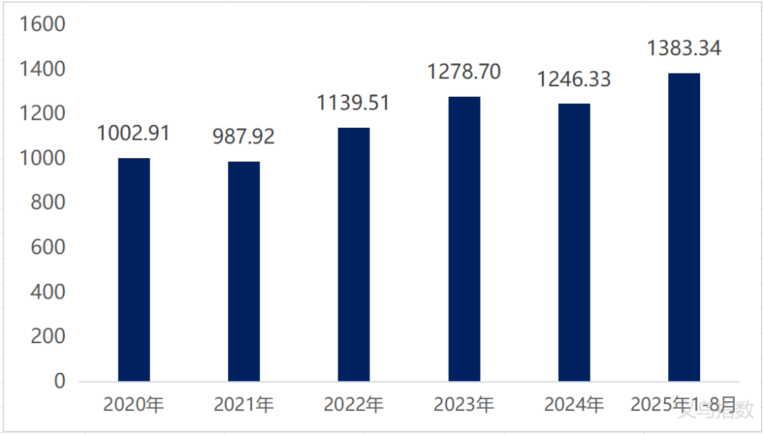 据义乌指数监测,自2020年以来,箱包类景气指数整体呈现平稳上升态势。从2020年的1002.91点攀升至2024年的1246.33点,涨幅为24.27%,2025年前8个月箱包类平均景气指数为1383.34点。未来,受中秋、国庆假期影响,预计仍延续上涨趋势。