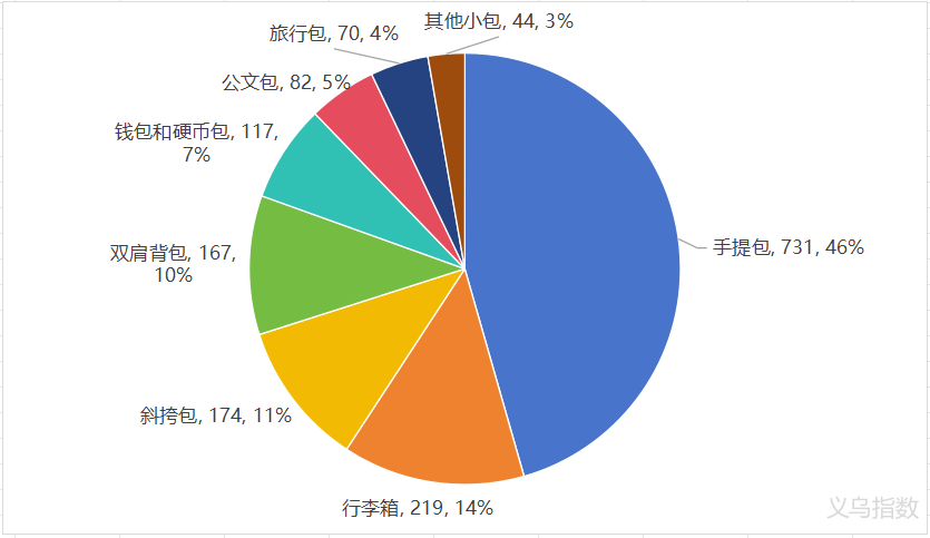 义乌市场箱包行业相关商户集中分布在义乌国际商贸城二区一楼、四楼。现有场内商位共1600余间,经营主体近1500户。从品类结构来看,场内主营品类包括背包、男包、女包、书包、拉杆箱、袋和其他箱包。其中,背包品类在义乌市场的经营主体数量最多,占比约为31%。