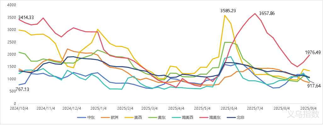 2025年9月上旬,宁波-欧洲航线当月调整至2540美元/FEU,航线运价指数为855.93点,较上月下降37.6%;宁波-美西航线运价指数为1338.84点,较上月增长20.1%;宁波-美东航线价格为3241美元/FEU,运价指数为1085.3点,较上月增长5.8%;宁波-中东航线运价指数为1067.15点,较上月上涨63.4%。