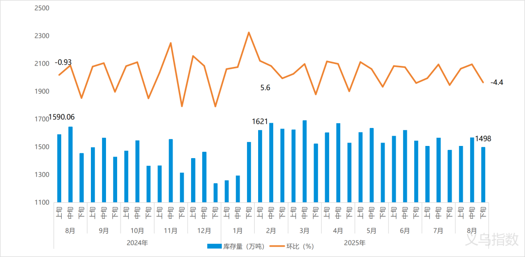 库存量下降:根据中钢协数据显示,2025年8月下旬,重点统计钢铁企业钢材库存量达到1498万吨,下降4.4%;与年初相比,增长21.1%;与上月同旬相比增加1.4%。