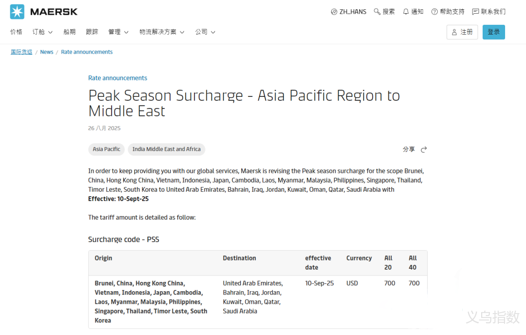 随着国际航运旺季临近,各大船公司陆续上调运费,涉及亚太至中东、非洲、南美等多条航线,单柜涨幅介于150美元至1600美元之间。其中,马士基宣布,自9月10日起对中国等亚太地区至中东航线征收700美元/柜的旺季附加费,法属波利尼西亚航线加收800-1600美元附加费。业内分析指出,受部分航线运力投放放缓及港口效率波动影响,今年海运旺季(9-12月)涨价趋势或持续至年底。