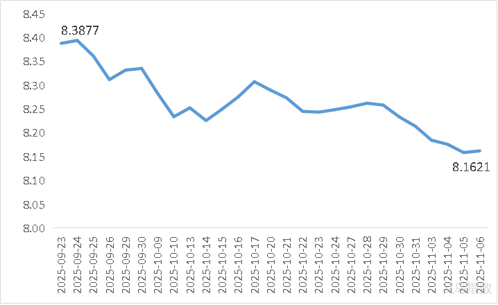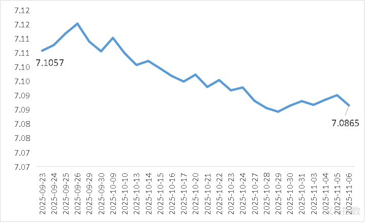 11月6日美元对人民币的汇率在7.1元左右,2025年10月美元/人民币的月平均汇率为7.0948,美元相对于人民币走弱。近期美元疲软的直接导火索,是美国9月CPI数据的超预期降温。核心CPI同比增长3.0%,低于市场预期的3.1%,环比0.2%的涨幅进一步印证通胀回落趋势,强化了市场对美联储将开启降息周期的预期,从而给美元带来下行压力。