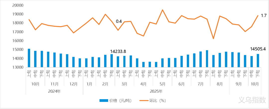 价格先跌后涨:2025年10月下旬全国流通领域棉花(皮棉,白棉三级)价格为14505.4元/吨,较上期上涨239.5元/吨。上半月因新棉集中上市承压下行,下半月随新疆采收收尾,南疆单产不及预期及籽棉收购价抬升,加之宏观利好,共同支撑棉价小幅回暖。