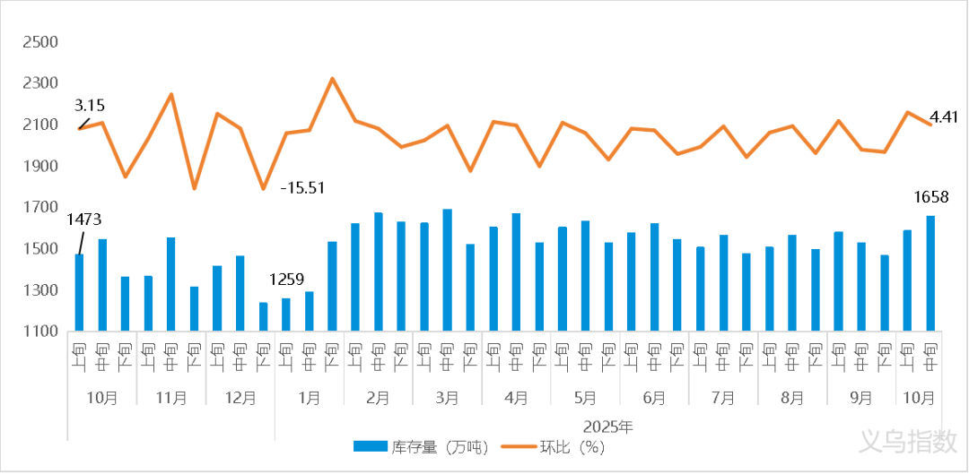 钢材库存增加:根据中钢协数据显示,2025年10月中旬,重点统计钢铁企业钢材库存量达到1658万吨,增长4.4%。与年初相比,增长34.0%;与上月同旬相比增加8.4%。