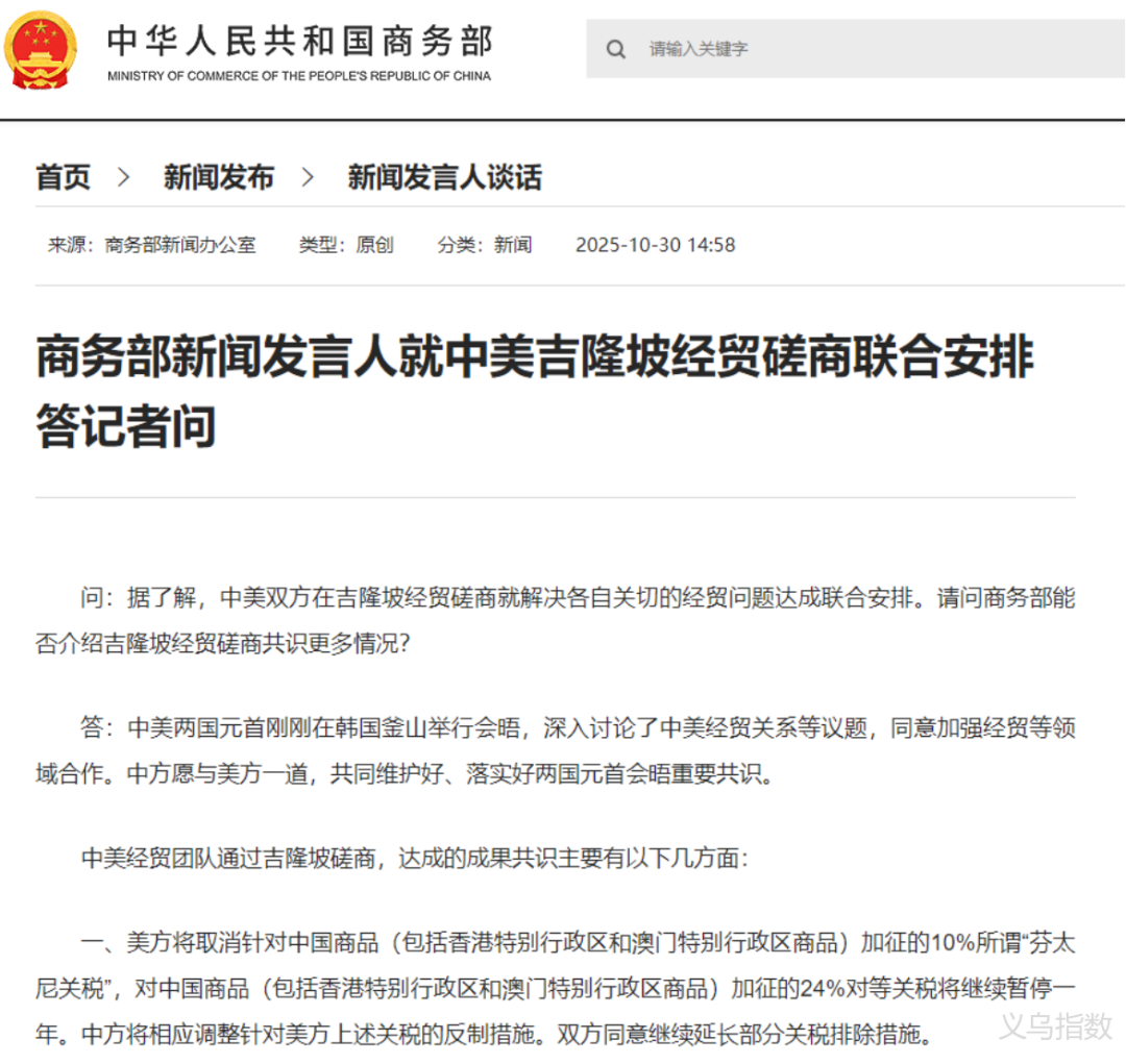 10月30日,商务部新闻发言人就中美吉隆坡经贸磋商联合安排答记者问。此次磋商,达成的成果共识主要有以下几方面:美方将取消针对中国商品加征的10%所谓“芬太尼关税”,对中国商品加征的24%对等关税将继续暂停一年,中方将相应调整反制措施(11月5日消息,国务院关税税则委员会发布公告,在一年内继续暂停实施24%的对美加征关税税率,保留10%的对美加征关税税率,调整自11月10日13时01分生效。)
