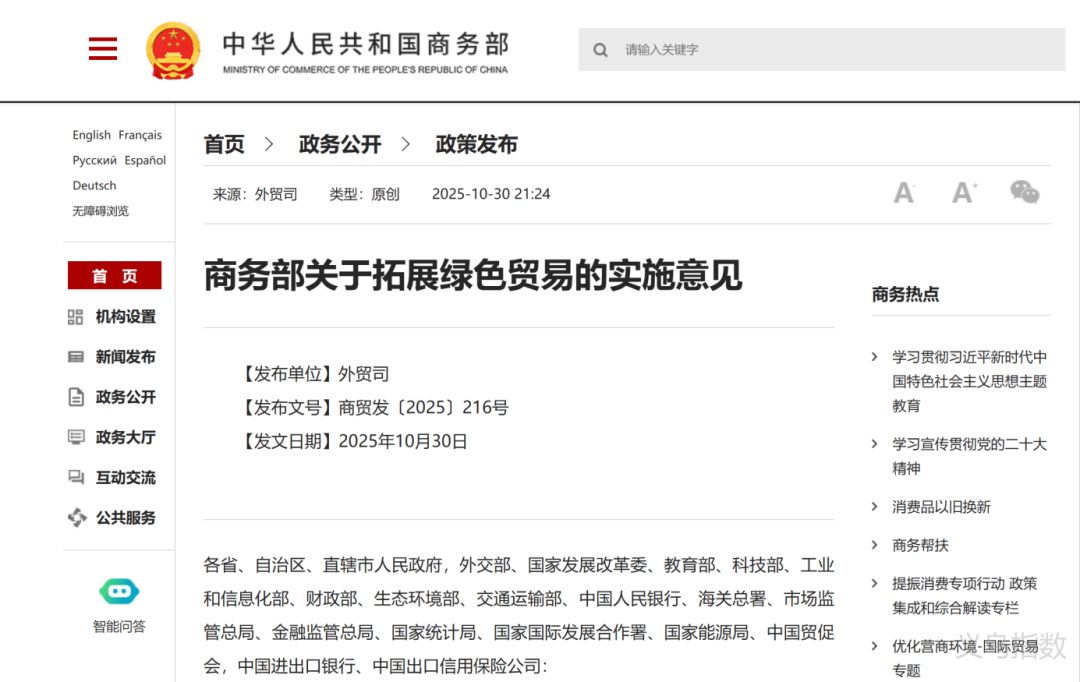 10月30日,中国商务部印发《关于拓展绿色贸易的实施意见》(简称《实施意见》),这是绿色贸易领域首个专项政策文件,其聚焦中国绿色贸易发展薄弱环节,制定针对性举措。意见聚焦提升外贸企业绿色低碳发展能力、拓展绿色低碳相关产品和技术进出口、营造绿色贸易发展良好国际环境及建立健全绿色贸易支撑保障体系四大方向,提出十六项具体措施。