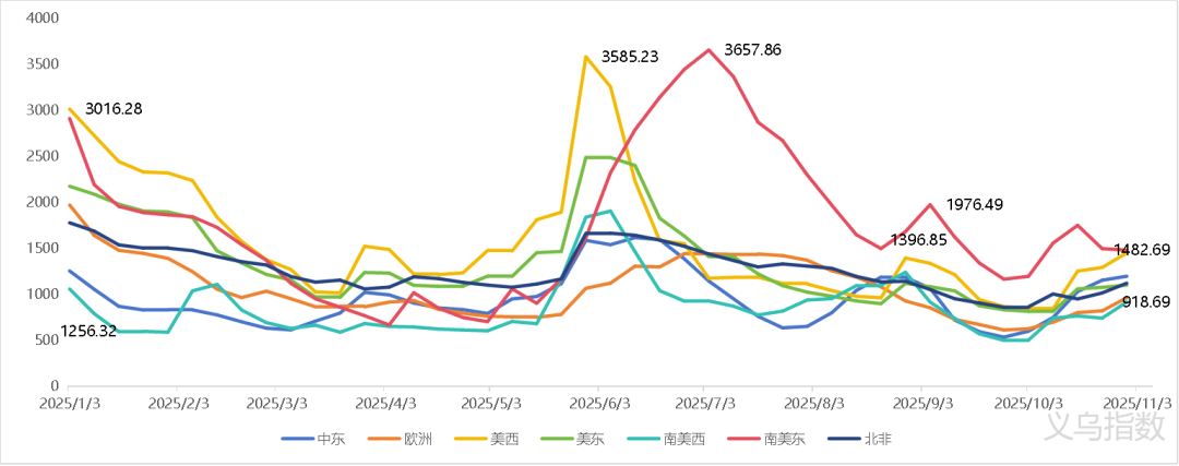 2025年10月下旬,宁波-欧洲航线当月调整至2284美元/FEU,航线运价指数为965.62点,较上月上涨57.23%;宁波-美西航线运价指数为1452.82点,较上月增长67.33%;宁波-美东航线价格为3628美元/FEU,运价指数为1102.42点,较上月上涨32.18%;宁波-中东航线运价指数为1198.68点,较上月上涨123.46%。