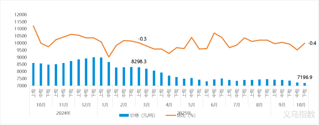 价格小幅下调:10月下旬全国流通领域聚乙烯价格为7196.9元/吨,环比下降0.4%。传统的旺季需求不及预期,整体需求同比下滑,下游工厂新增订单有限,采购多以小单刚需为主,对价格无法形成有效支撑。