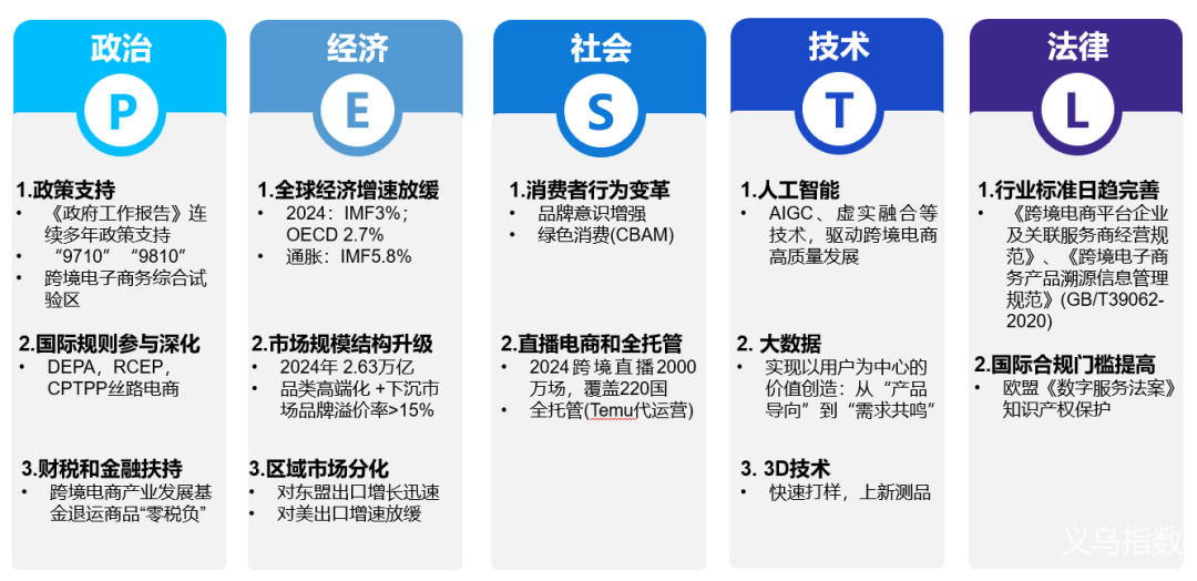从我国跨境电商面临的全球环境看,当前全球贸易格局深刻变化,且地缘因素变化较快,整体处于机遇和挑战并存时代。
