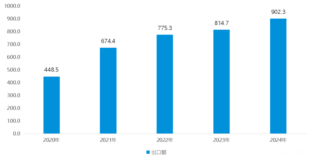 总体规模持续增长,近年增长态势良好:墨西哥同中国的贸易额一直在增长,从2020年的608.46亿美元增长到2024年的1094.26亿美元,增幅达79.84%。其中,2024年中国向墨西哥出口额902.32亿美元,进口额191.95亿美元。