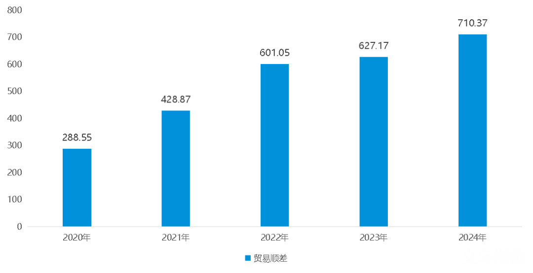 贸易顺差明显:中国对墨西哥长期保持较大的贸易顺差。从2020年到2024年,中国对墨西哥累计实现贸易顺差2710亿美元,近五年贸易顺差年均531亿美元,2024年的贸易顺差为710.37亿美元。