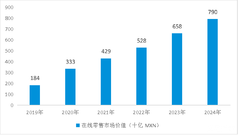 在“年轻人口+城市聚集+强消费意愿”的多重因素驱动下,直接催生了电商爆发式增长:2024年,墨西哥在线零售市场收入达7897亿比索(约391亿美元),同比增长约20%,比2019年增长300%以上,年均增速高达33%,远超全球平均的25%。