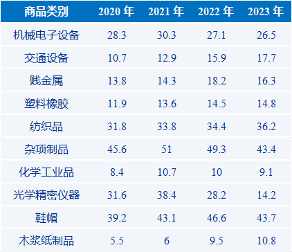 中国出口前十大商品占墨西哥进口比例(单位:%)