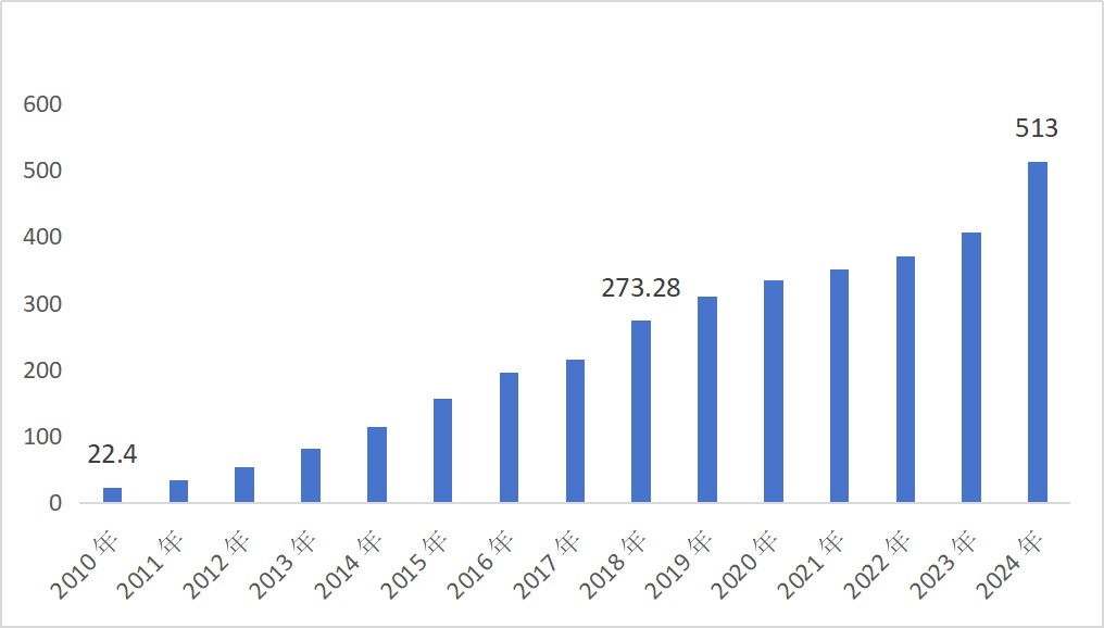 2010-2024年,中国宠物用品行业市场规模从22.4亿元大幅攀升至513亿元,增幅高达2190.18%,复合增速达24.4%;