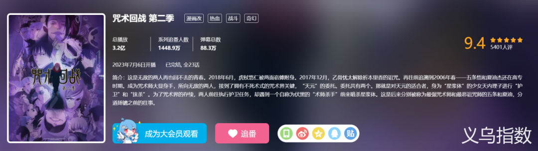 第一类是日本动漫IP,如《排球少年》《咒术回战》《蓝色监狱》《间谍过家家》等。这些作品在全球范围内拥有极高人气,如《咒术回战》在B站的追番人数达到1448.9万,《间谍过家家》的追番人数也高达1364.8万,播放量和讨论热度均居高不下。