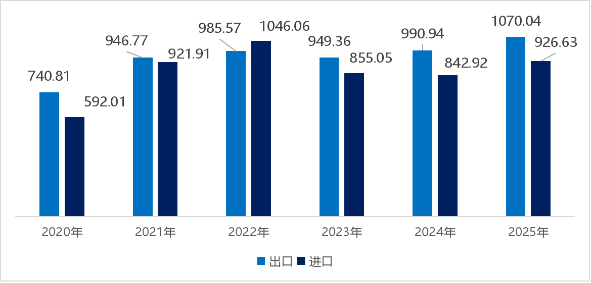 2025年,中智双边贸易额达669亿美元,较2020年增长51.8%。其中,智利自中国进口额为251.3亿美元。同时,智利在与中国的双边贸易中长期保持顺差,是其外贸顺差的主要来源。
