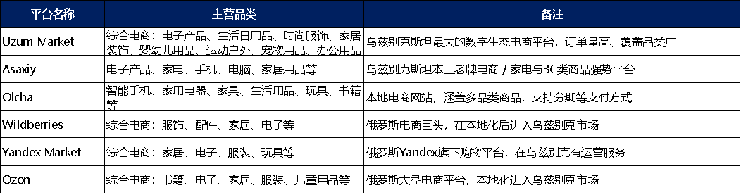 乌兹别克斯坦电商平台格局呈现出本土平台领先、国际平台逐步渗透的特点。Uzum是该国最大的数字生态系统,涵盖电商平台、金融科技和物流服务,平台日均订单量超10万单。其他本土平台包括Asaxiy、Olcha和Glotr。在乌兹别克斯坦运营的主要国际电商平台包括速卖通(中国)、Wildberries(俄罗斯)、Yandex(俄罗斯)和Ozon(俄罗斯)。