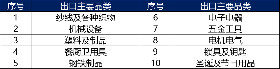 从义乌对乌兹别克斯坦的主要出口品类情况来看,纱线及各种织物、塑料及其制品、餐厨卫用具、电子电器、圣诞及节日用品是近几年义乌出口乌兹别克斯坦的主要商品品类。
