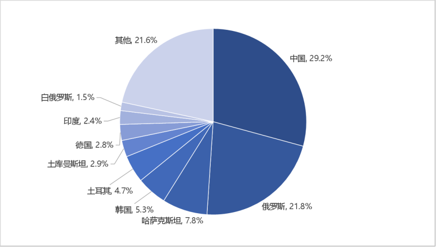 从主要的进口来源国看,2024年乌兹别克斯坦进口排名前三的地区分别是中国、俄罗斯和哈萨克斯坦,分别占比29.2%、21.8%、7.8%。