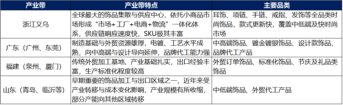 我国饰品行业经过长期发展,已形成清晰的产业集群格局,整体呈现以浙江义乌、广东广州、深圳为主导,多区域协同分工的特征,共同支撑起国内外饰品消费市场。