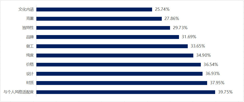 个性化与场景化成为核心。消费者不再满足于大众款式,对表达自我风格和适配特定场合的饰品需求激增,推动定制化、轻奢化发展。数据显示,中国消费者在购买珠宝饰品时所关注的因素中,“与个人风格的适配度”以39.75%的占比居首位。